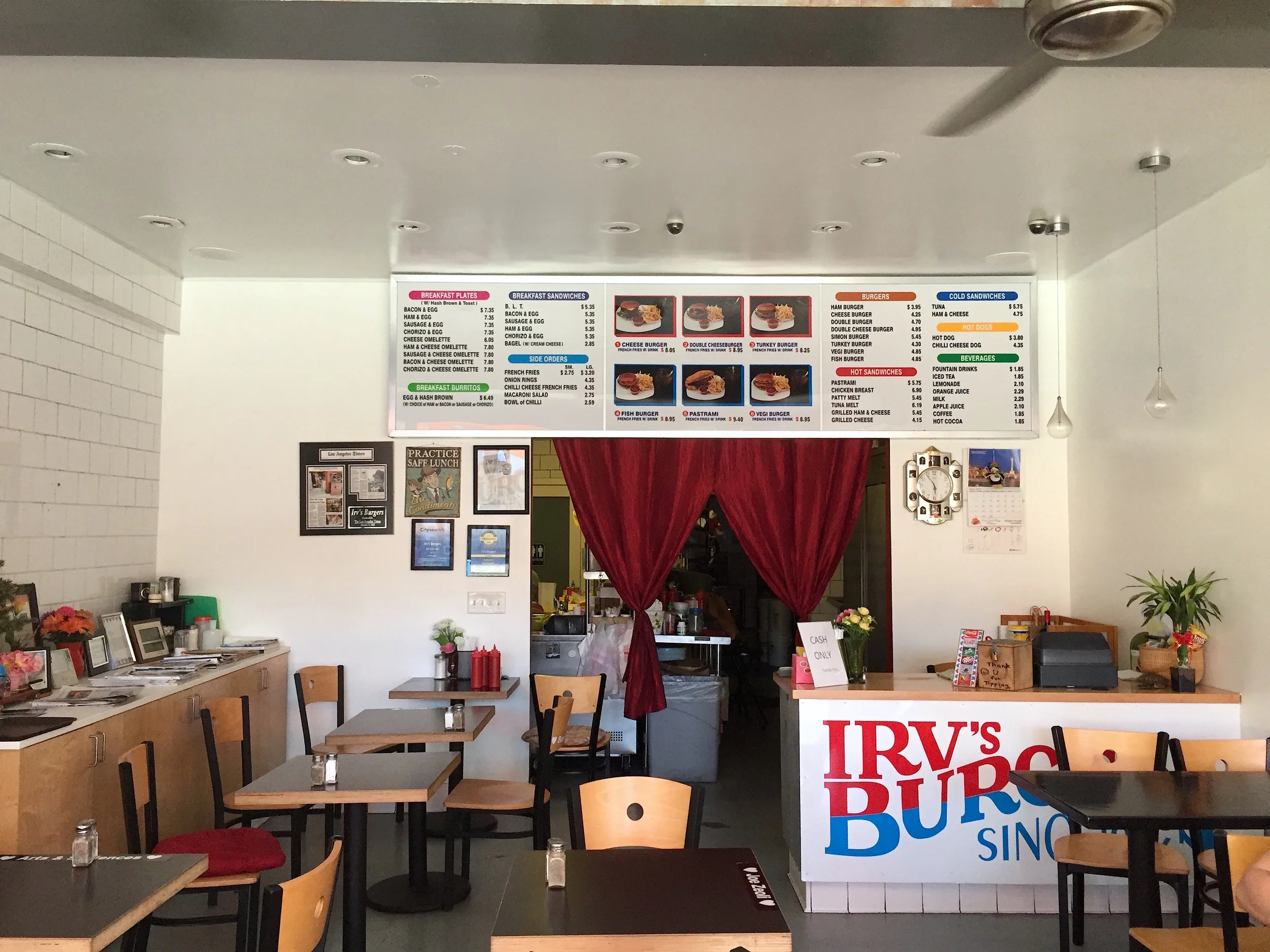 Although no longer a burger stand, the new Irv's is basically a cafe - a refreshingly simple no-frills space with some homely knick-knacks, the only mild ostentation some crushed velvet curtains in front of the kitchen. Upon entering we were greeted by the rambunctious proprietor Sonia, literally the most amazingly friendly person of all time. She makes Disneyworld employees look like a bunch of misery emos. And the double cheeseburger she makes is as quintessentially American as it is fucking awesome.